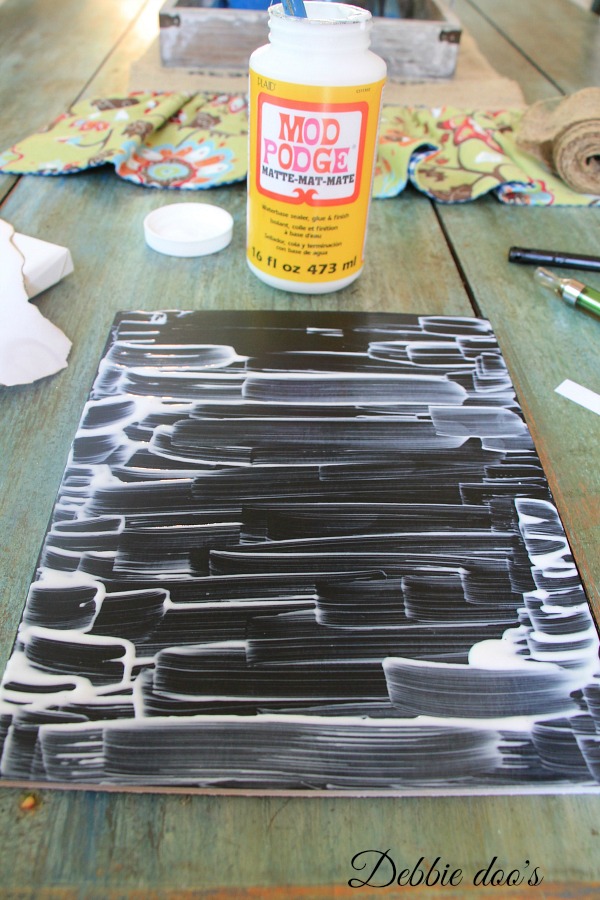 And then gently place it on the foam chalkboard, smoothing out with your finger and slightly brushing more mod podge on the edges.