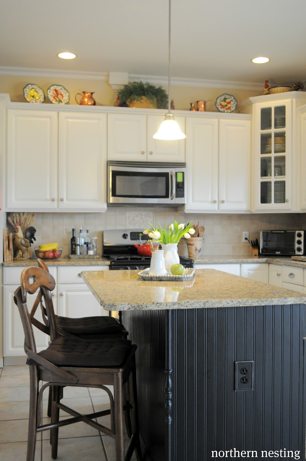 Last year the hubby and I gave our plain builder basic kitchen island a makeover. We added bead board and decorative molding and painted and distressed it black. LOVE this change!