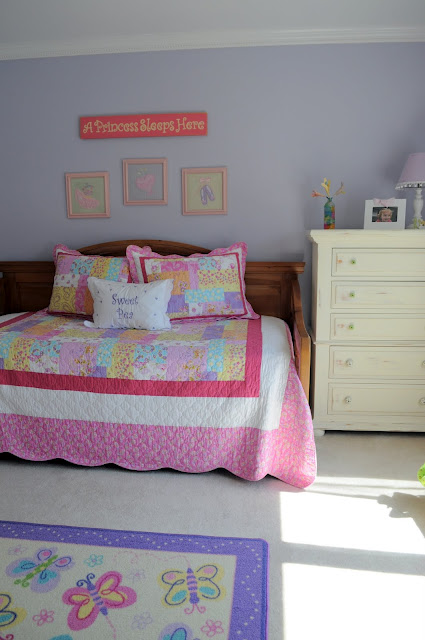 This is my oldest daughters bedroom and bath. We painted and added the bead board to her bathroom last year. Every bedroom having there own full bath was a BIG plus when we looked at this house.