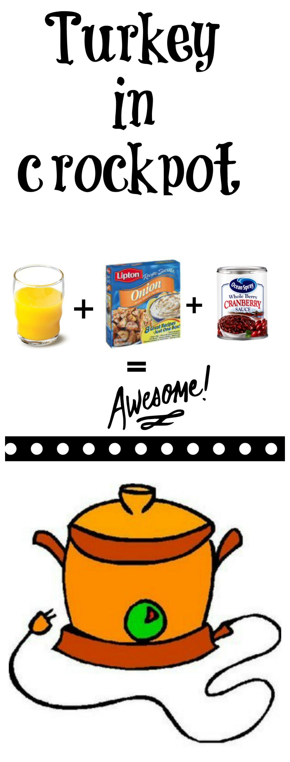 1. Add two cups of orange juice. Pack of lipton onion soup. One can of Cranberry sauce. Put in small Turkey or Turkey breast and cook 8 hours on low. So delicious!