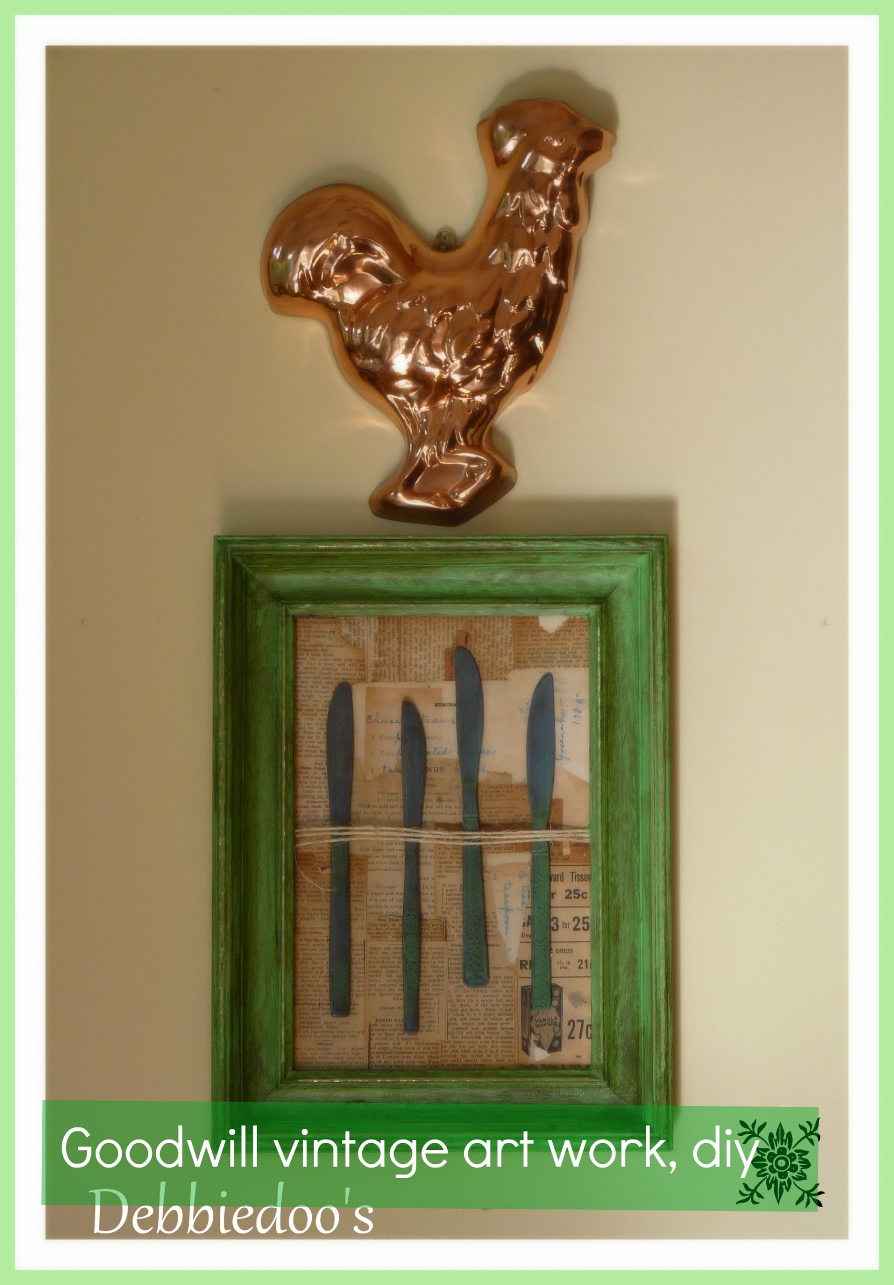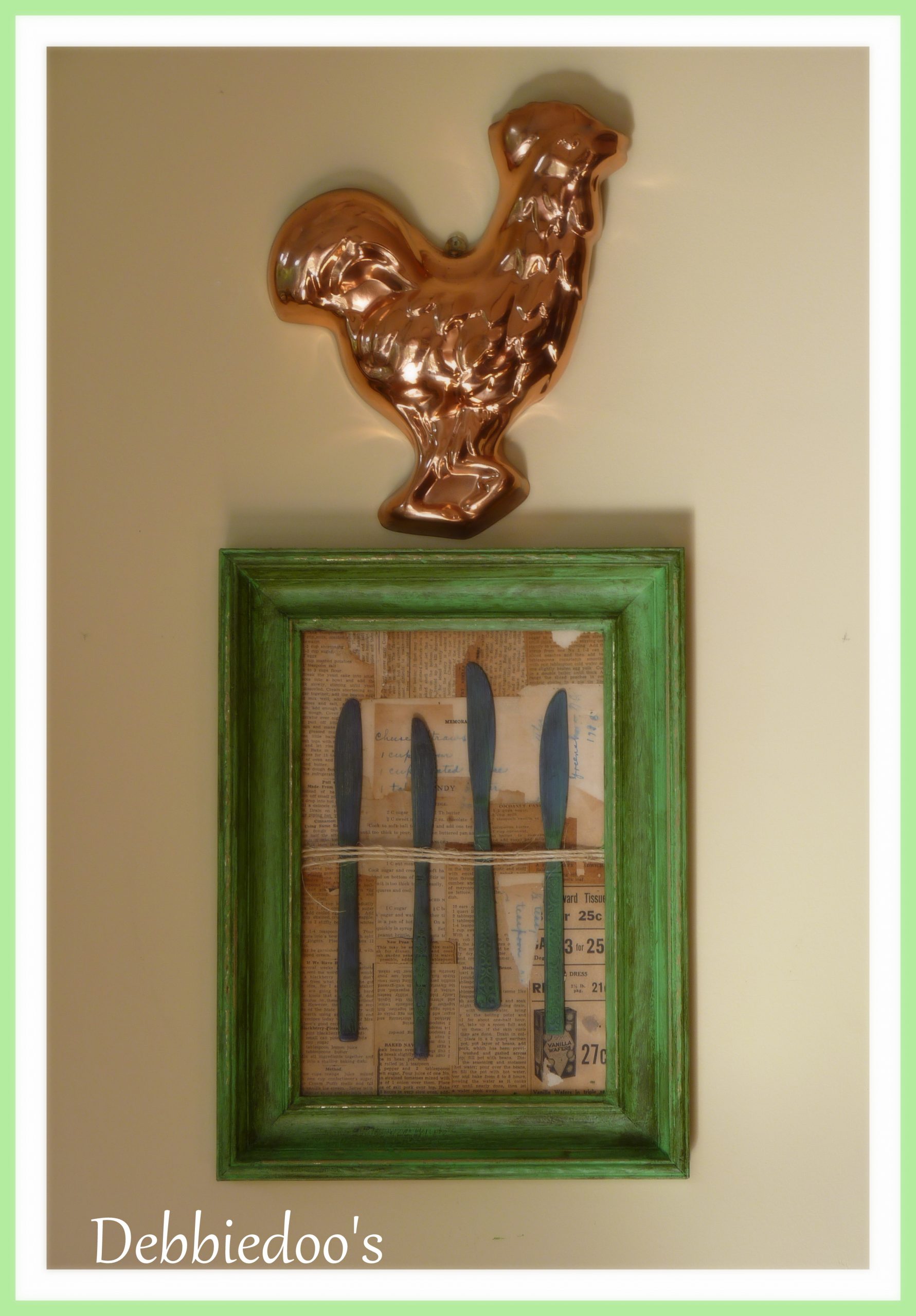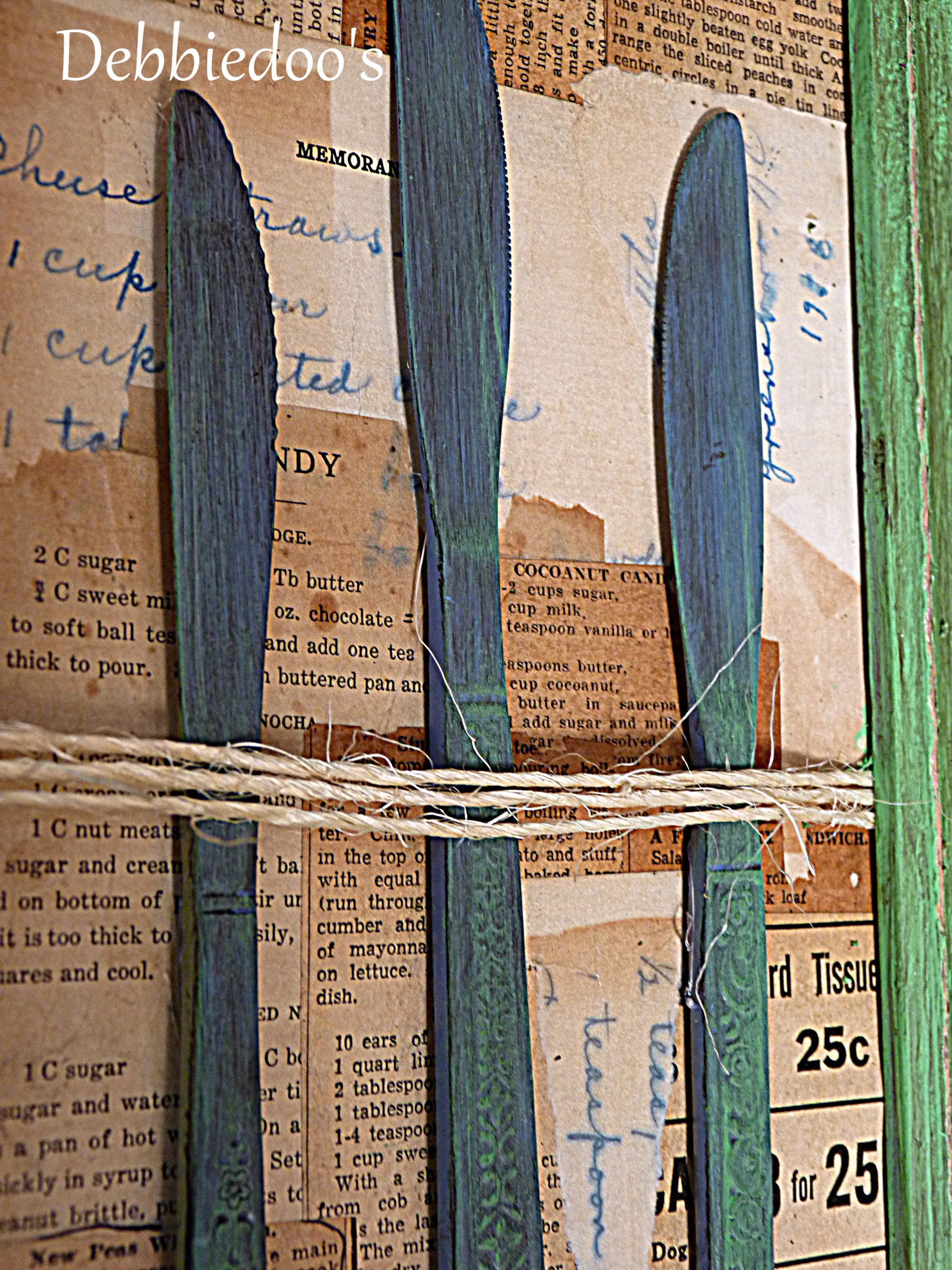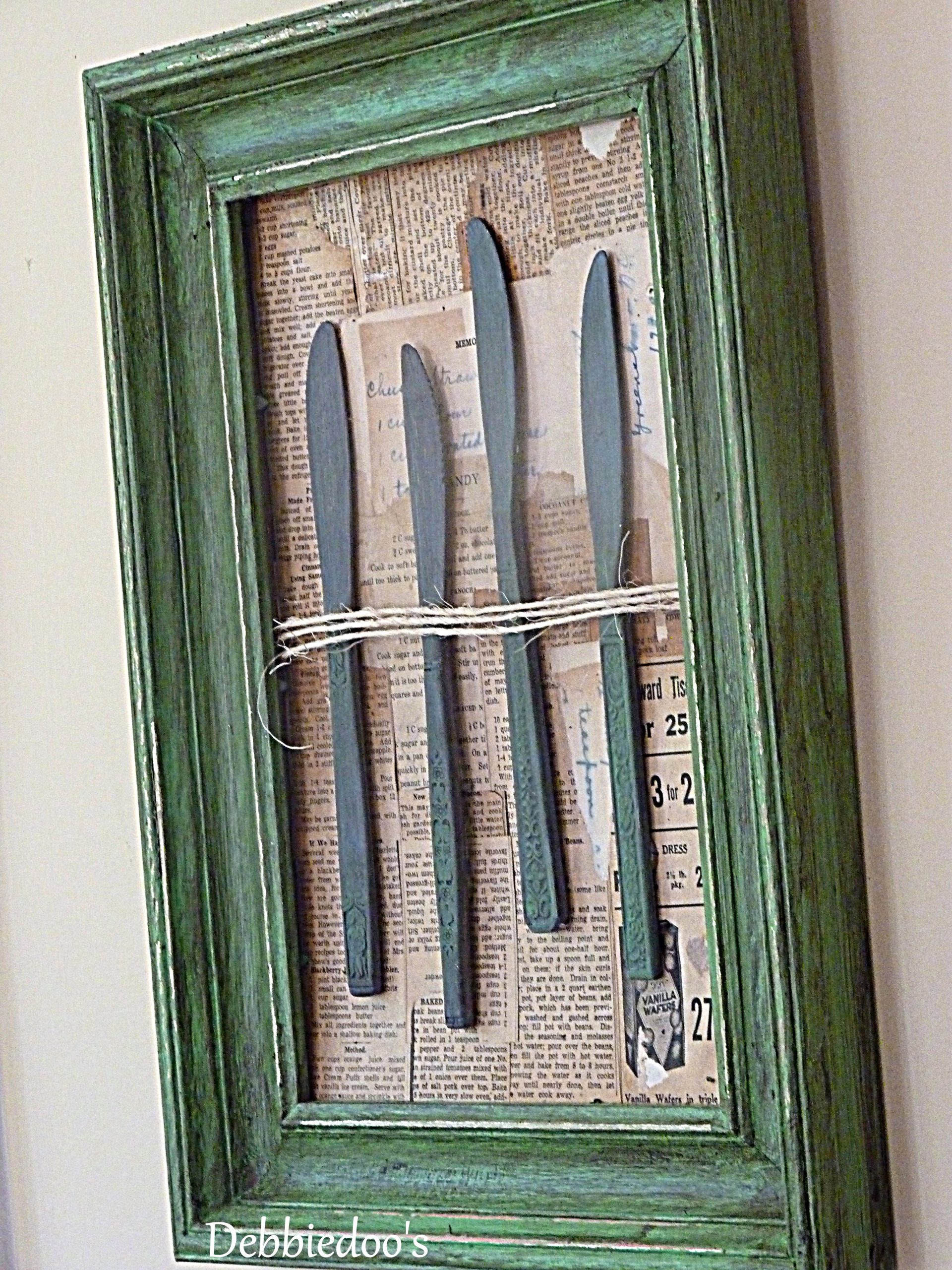 Hi Debbie; I love the frame/cookbookpages/knives/string you painted, mod podged and glued onto the picture you created. Thanks for hosting.
