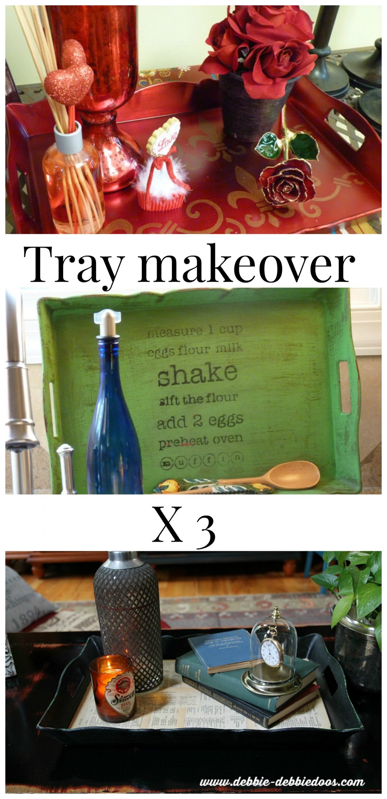 I love the tray in black, Debbie! Yes, I would say you have definitely gotten your $2.00 worth out of this tray with three transformations. : ) Love the vignette you have set up on it, too.