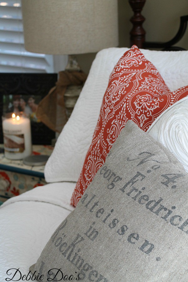 This room looks so inviting and comfortable…I was trying to figure out what part of the room is my favorite but I just can’t decide….I love the little side table (paint and design is beautiful), the burlap pillows…(you have inspired me with burlap…I’ve never even thought about it until I started reading your blog:), the throw is beautiful, the paint is very calming, etc etc etc….you just really have a special knack…thank you for sharing your creations:) I’m so happy for your family and your mom’s recovery..God bless you all!