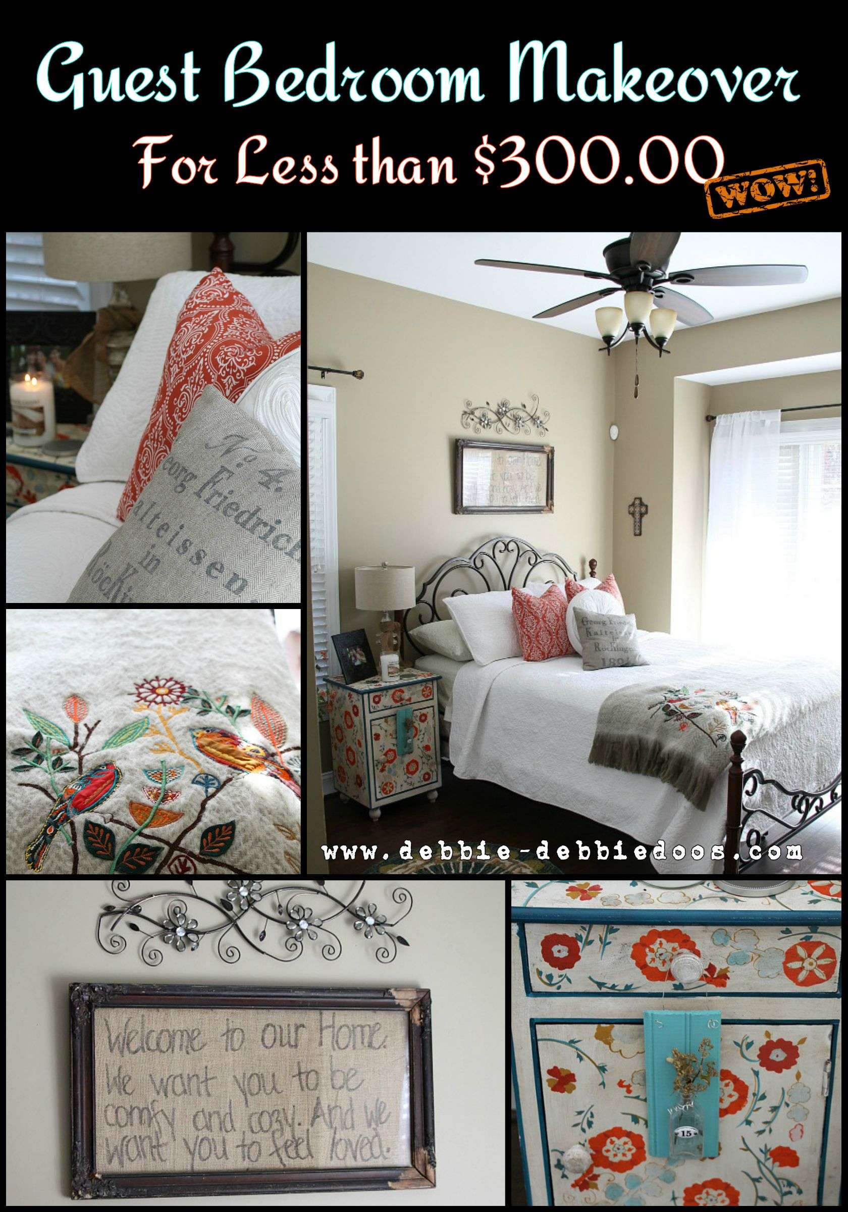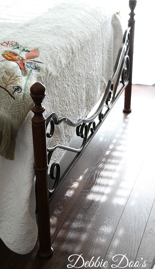 Beautiful room makeover Debbie!…just love the bed frame…and to think that you have done this gorgeous makeover for a teeny bit over $300 is amazing!!! Continued prayers for your mom Debbie!