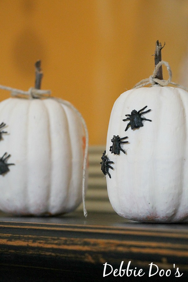 Those little white pumpkins are my Fall Dollar tree pumpkins I did a few weeks ago. I simply turned them around and hot glued creepy spiders on them. Two for oner!