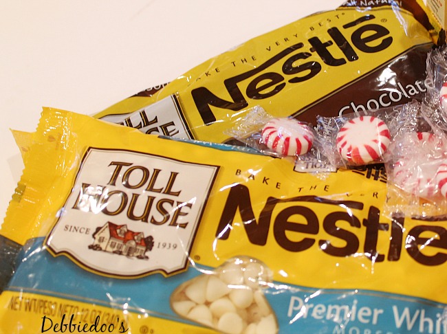 Start off with your preference of  chocolatechips.  I used one bag each, one white, one dark.