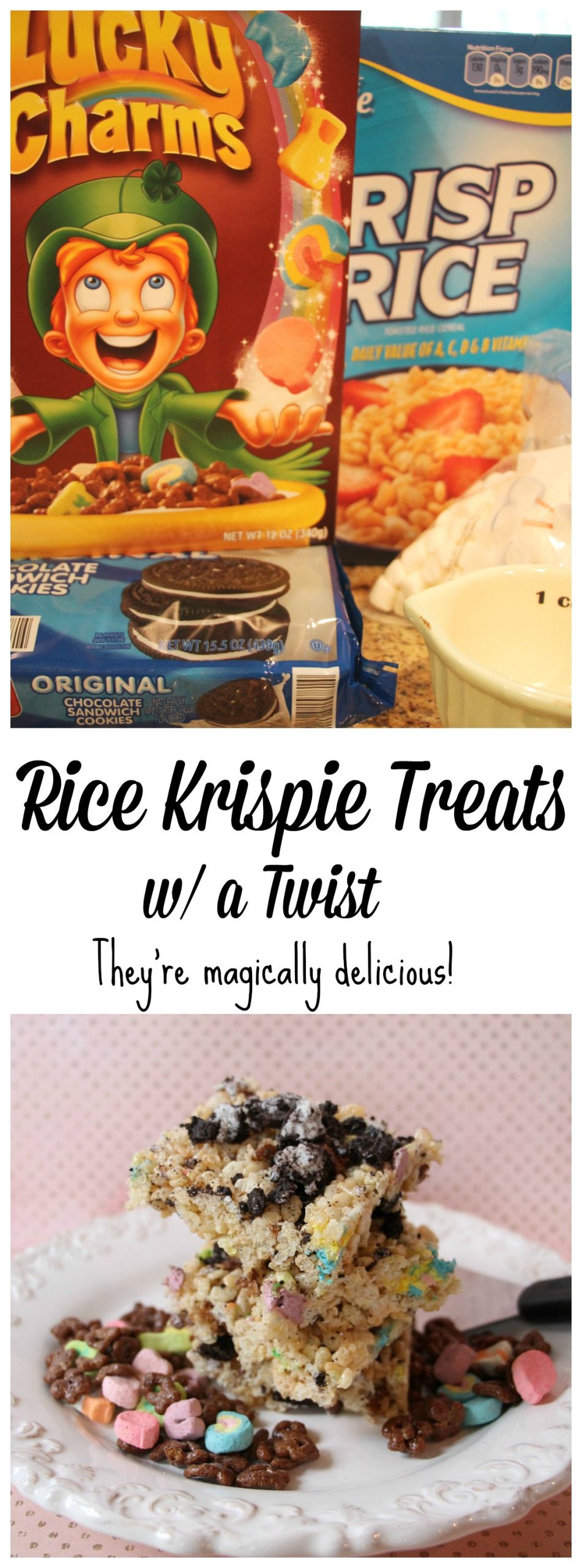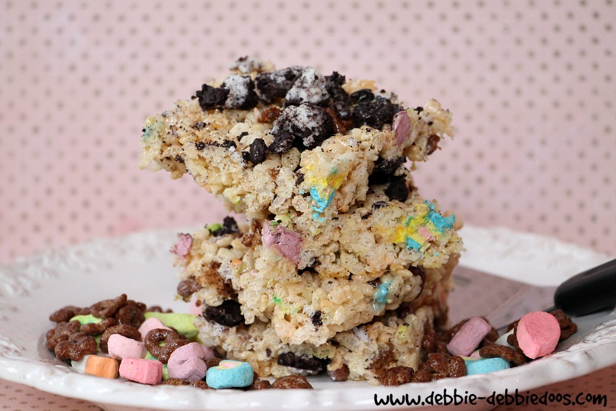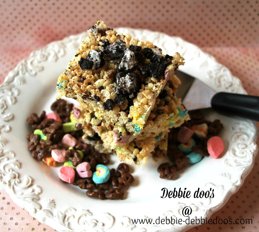 What? Rice Krispie treats with OREOS? And with Lucky Charms? This would so totally hit the ball out of the park if brought them for some kid-filled function. I would be the popular old lady. I think I’ll make these this summer when they nag me about bringing something for vacation Bible school.