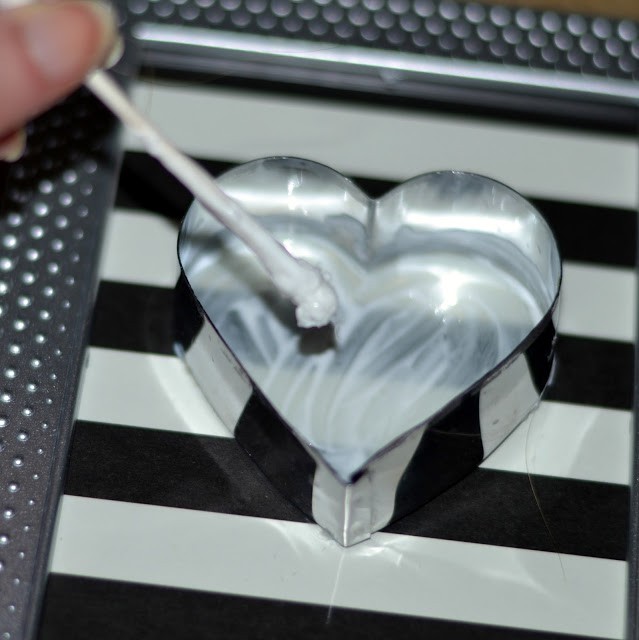 I knew I wanted to also have a heart pattern all filled in with buttons so I thought I would use a heart shaped cookie cutter as my guide. It was the perfect size! I took a q-tip that I had dipped in craft glue and rubbed it around the edges and inside the cookie cutter.