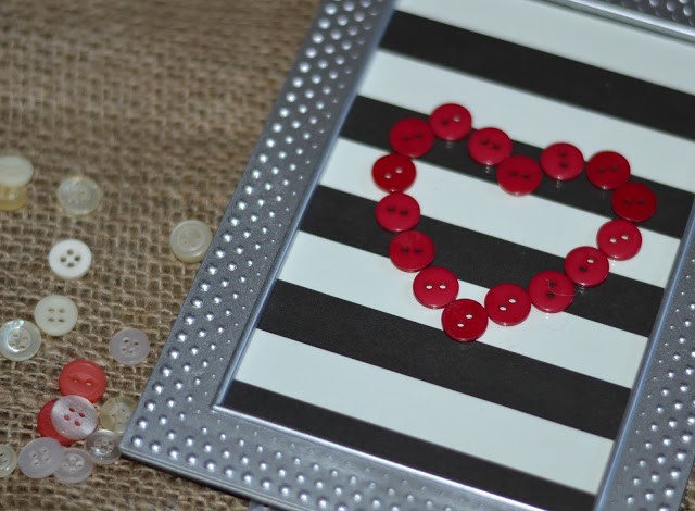 Red is my absolute favorite color. I just love the energy that it brings and how it automatically livens things up a bit. Maybe that’s why I gravitate towards all things hearts and Valentine’s. I created this Valentine’s Day framed button art with a clearance frame, some striped scrapbook paper and some buttons I had collected in my button jar.