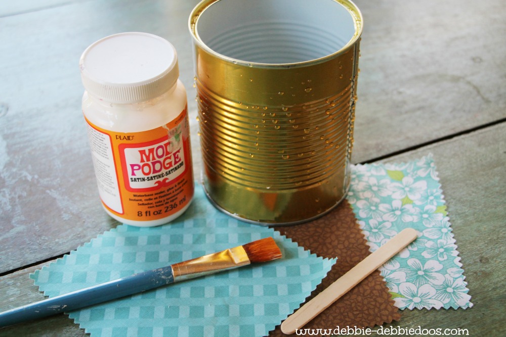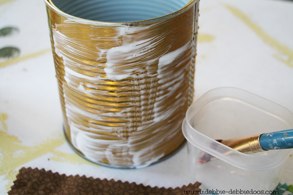 I like to mod podge in sections as you can see. Paint the mod podge on the can