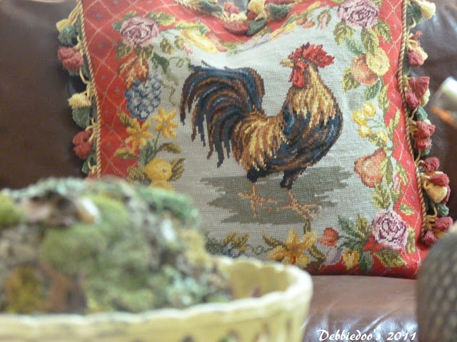 Love the Rooster pillow, it sure makes the space look fantastic. It's just the right item for the sofa. I am having a giveaway starting tomorrow and thought of you Debbie, you will know what I mean when you take a look. LOL I will take that pillow of your hands if you ever tire of it. Lovely!
