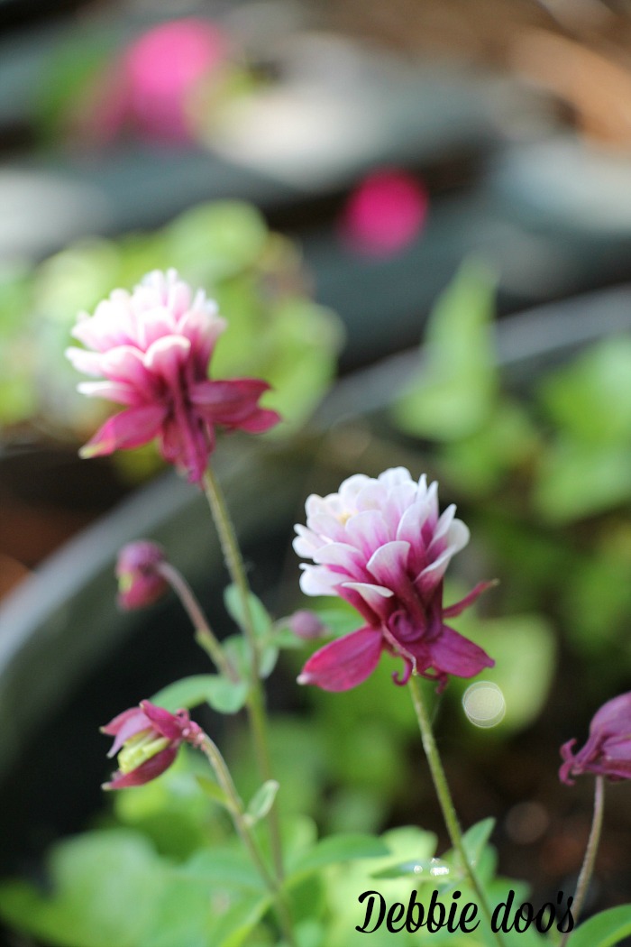 Β These lovely Columbine flowers just pop Β up every year in some big barrels I have lined up Β along the fence line.