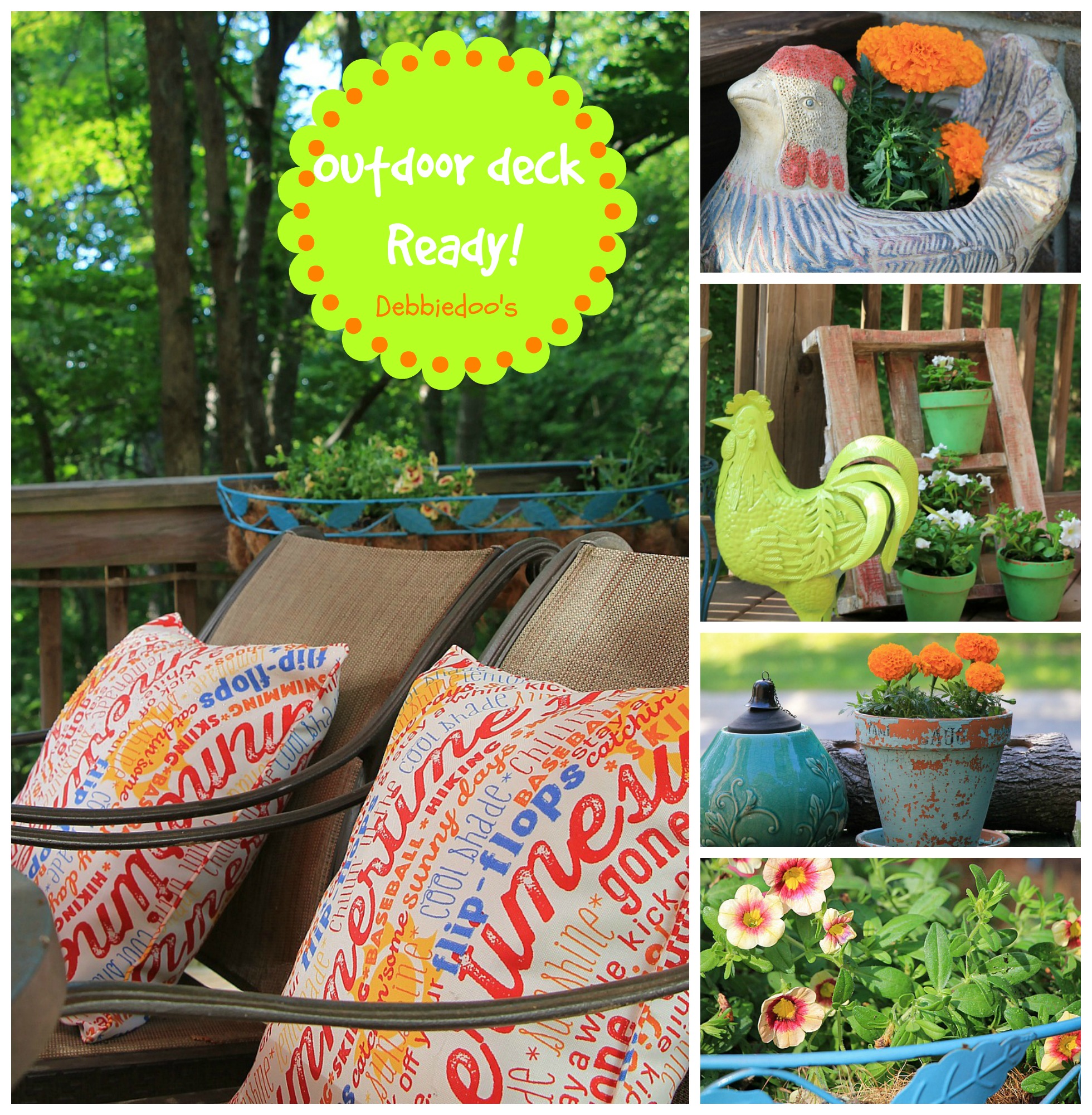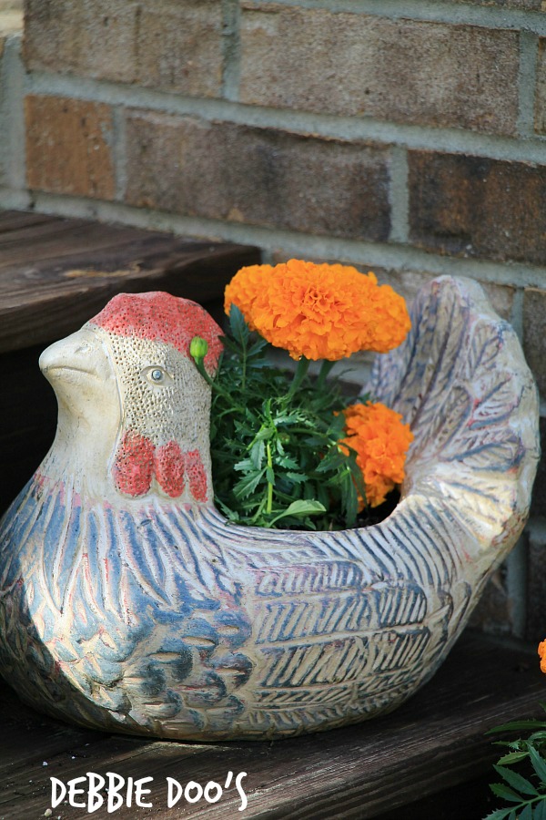 I just LOVE the variety of planters that you have on your deck – especially the rooster ones. What a fun addition! Mine are all plastic planters (durable, but boring) and I just love your creativity. π