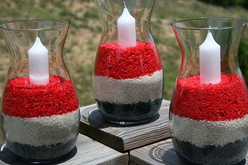 Love the vases with simple colored layered sprinkles and a candle patriotic centerpiece.