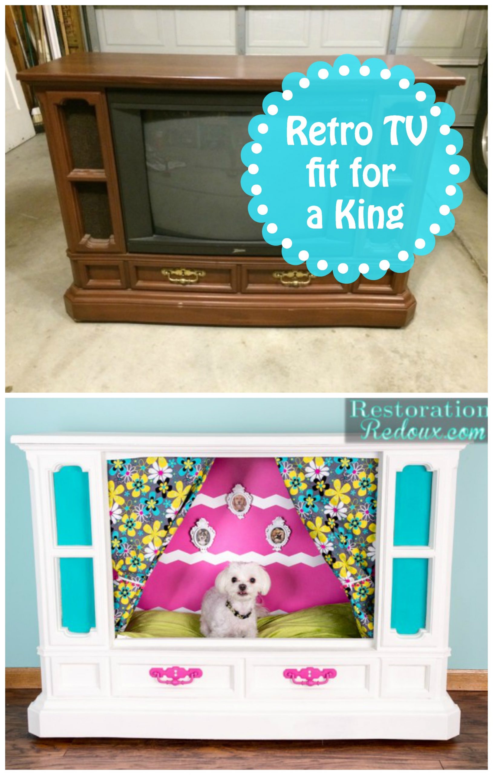 I just got this same tv outta the trash and turned I’m in the process of turning it into my dogs bed and just stumbled onto this. Awesome! Im doing white with a black back drop and black and white patterned cushion with the same fabric the rest of the room is decorated in.