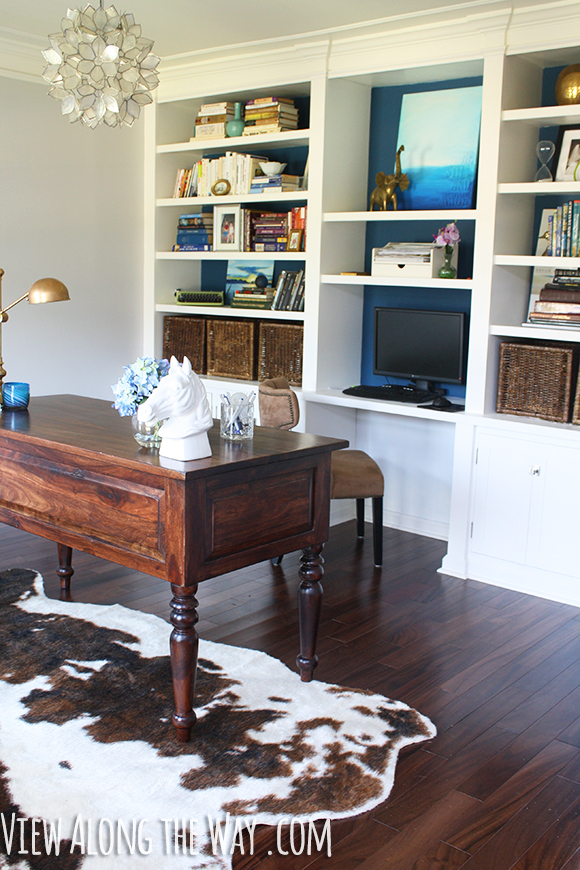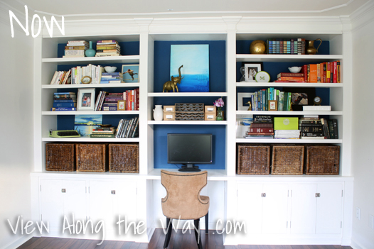 Thank you so much!! I had to jump in and let ya know – yes! We have all the ugly typical office stuff, but it’s hidden away in those cabinets. My husband has some kinda crazy setup where they’re all wired together inside the cabinetry. Actually our DVR and TV equipment are in those cabinets too, and the TV is on the other side of that same bookshelf wall, but he has it wired through the wall. No visible wires = happy wife. π
