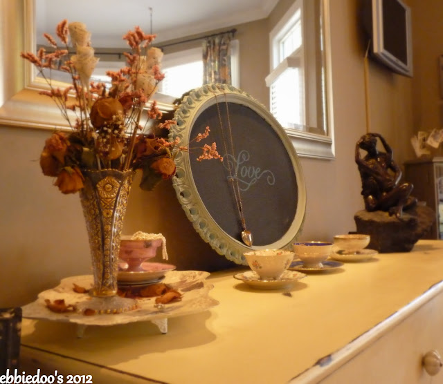 I brought out a few of my favorite, and I decided I would make my own pretty vignette on our bedroom dresser.