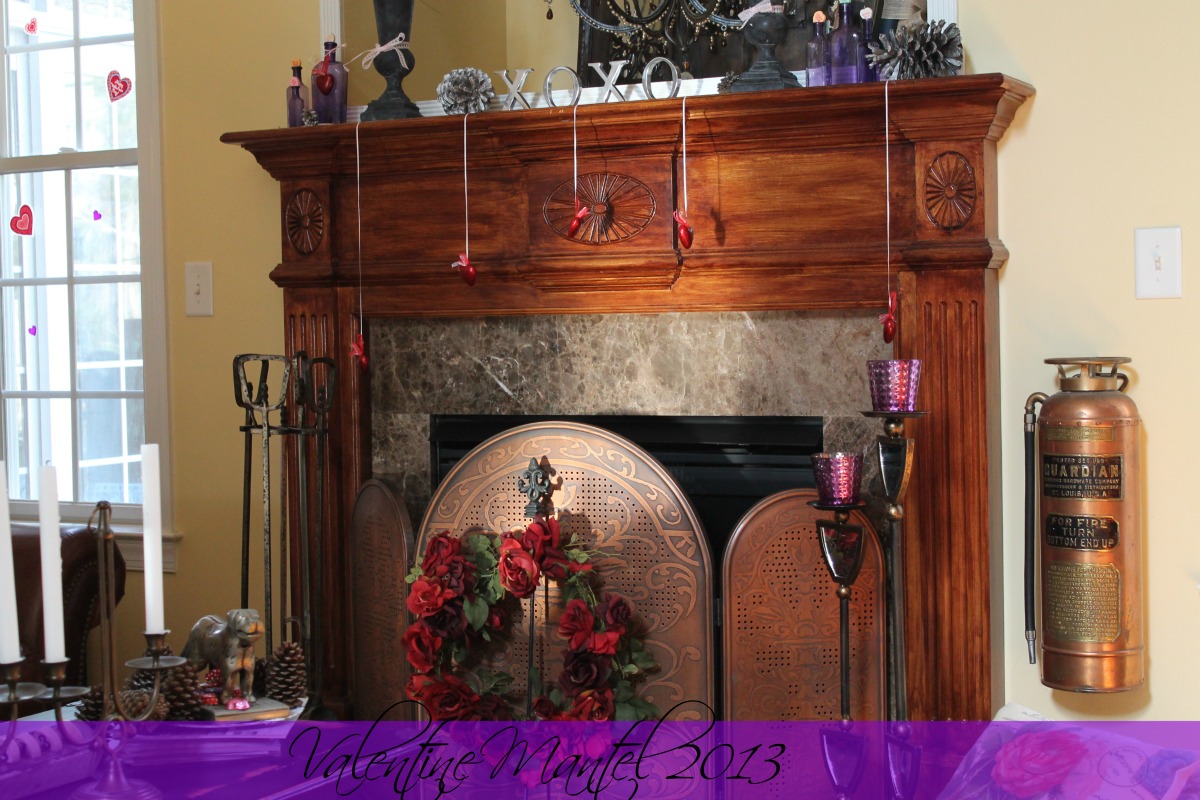 Great mantel Debbie…love the “hanging hearts”!!…and the purple vintage bottles are great!