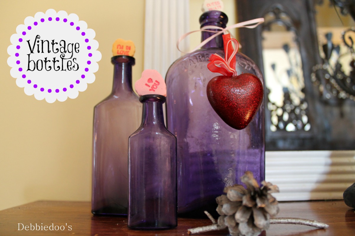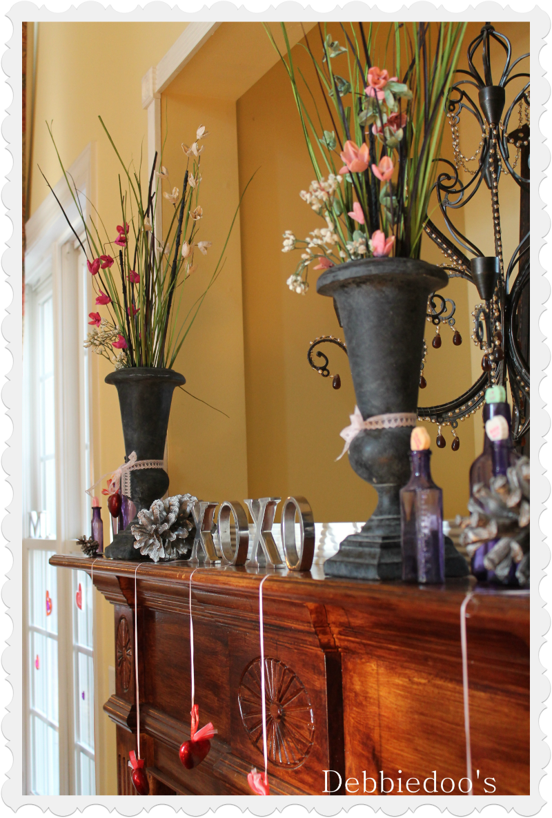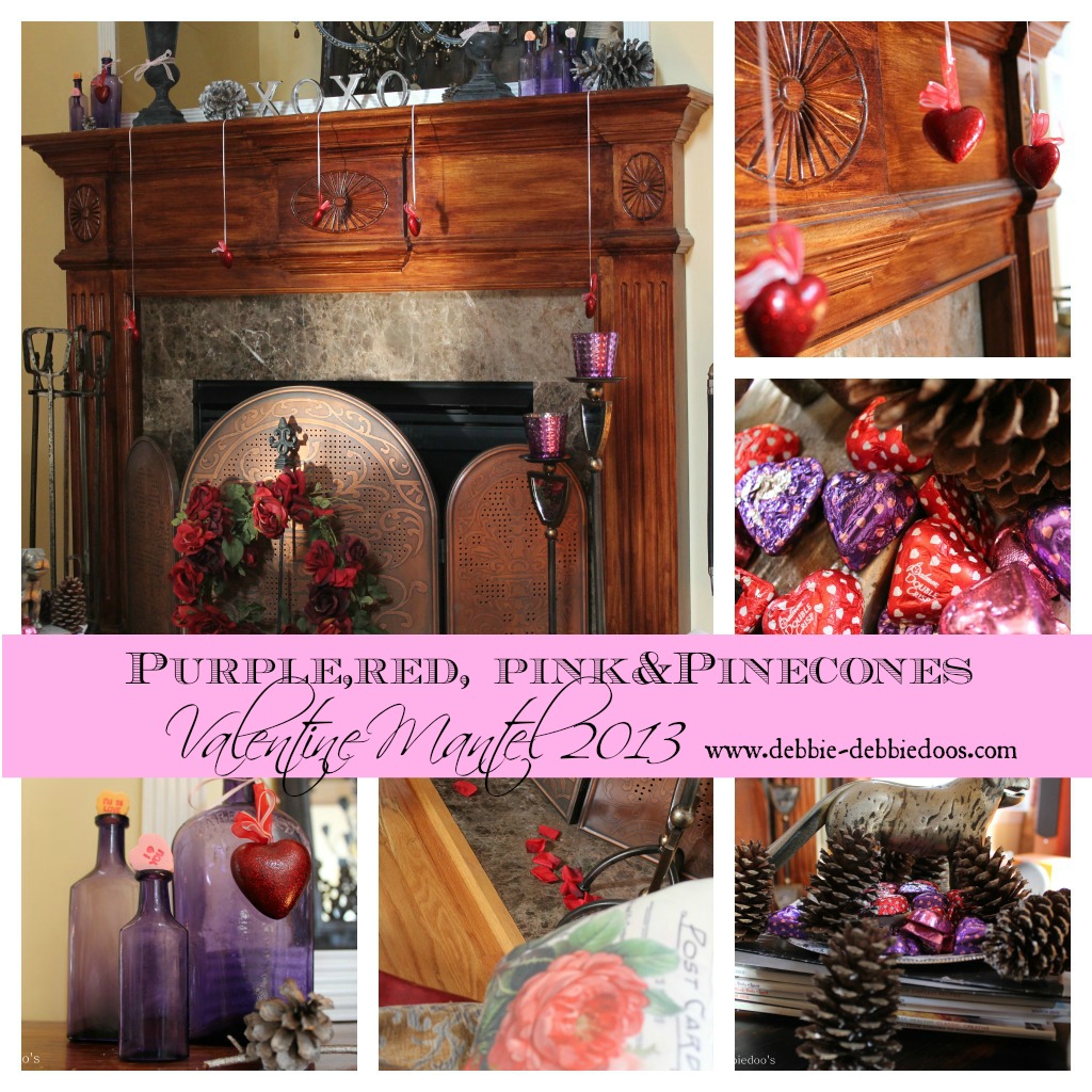 Oh, Debbie, I love, love your mantle! The purple bottles look so pretty with the red and pink colors and the little hanging hearts just finish it off so beautifully. Love this look. So original!