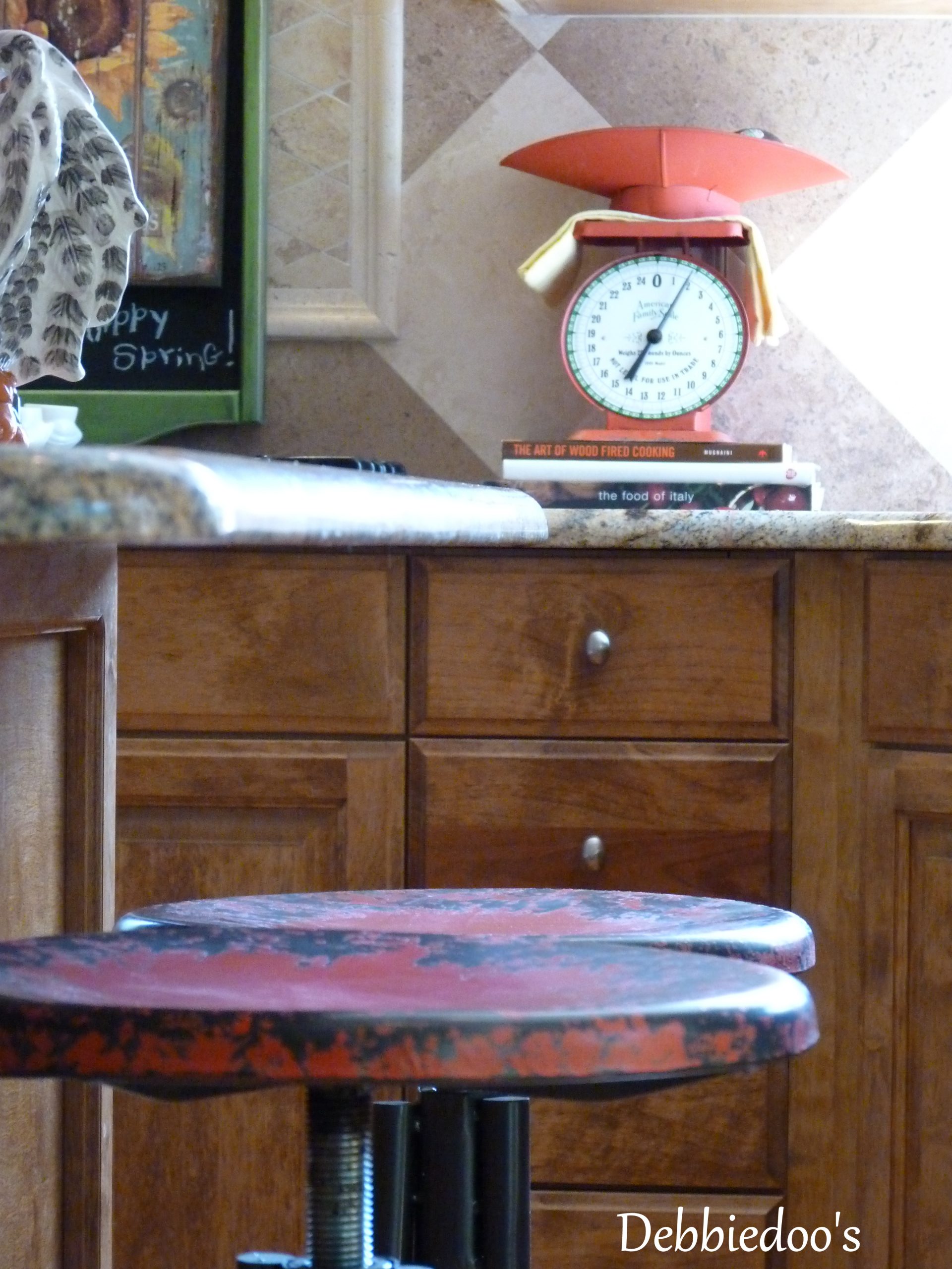Oh, I love those industrial stools, Debbie. That weathered paint….Yum!