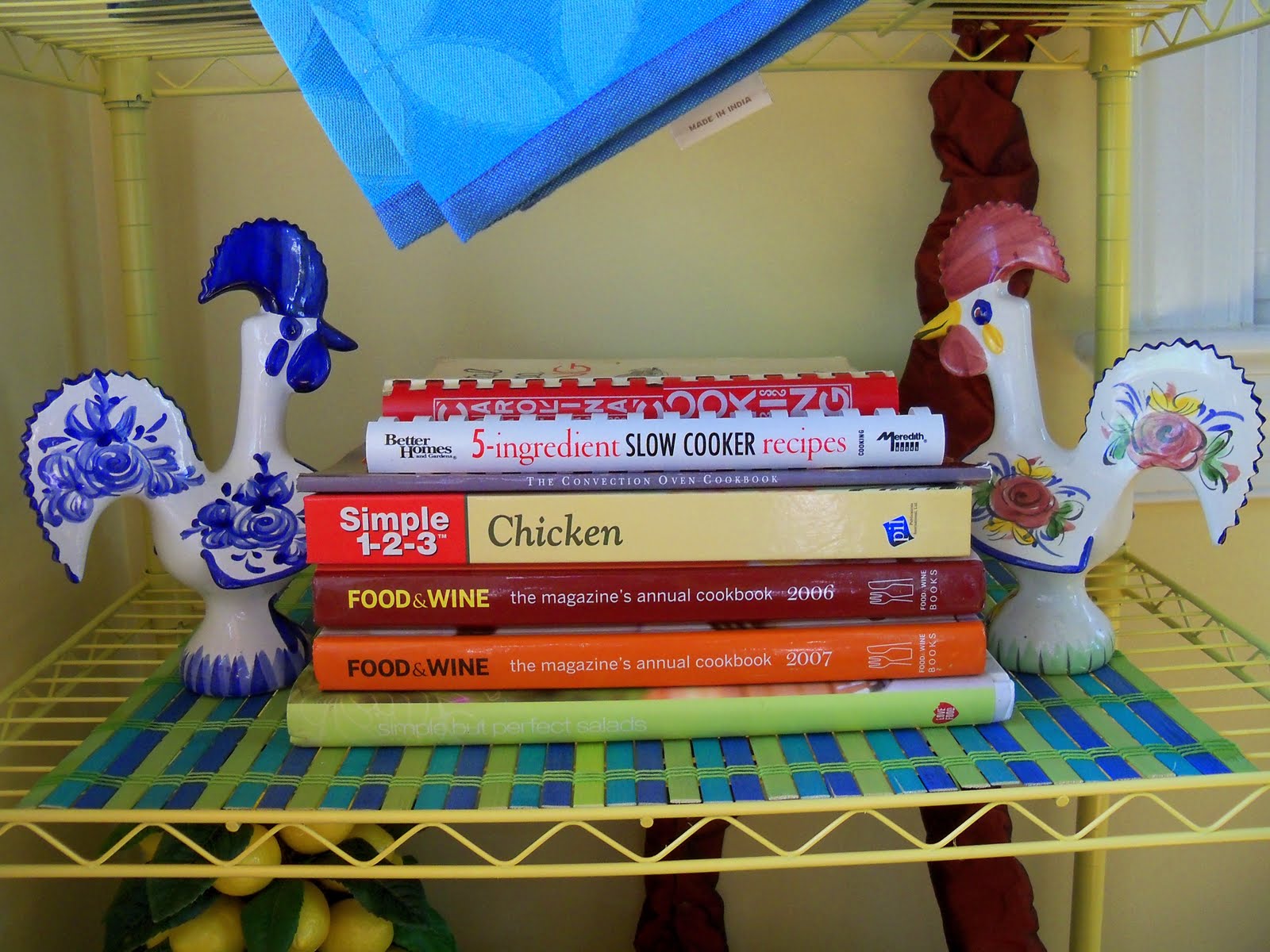 Okay Deb so I know Im in older posts like you said but once again I found some lemons….I LOVE LEMONS! Your rooms have all my favorite things, lemons,roosters and color! Are the branches in that vase real? OMG do you have a lemon tree? I have 2 of those racks. lol They were kitchen storage in my old home and now they are outside one on either side of the 2 bbq grills. Guess what I feel a painting party coming on. Im going to paint them one of the colors of my mexican talavera tile. I have a picture of them somewhere..but they have red,blue,lime,off-white,golden yellow. Thanks so much for a new idea. Its always a pleasure browsing you blog. Its like my bedtime story..lol it's now 12:07am. goodnite
