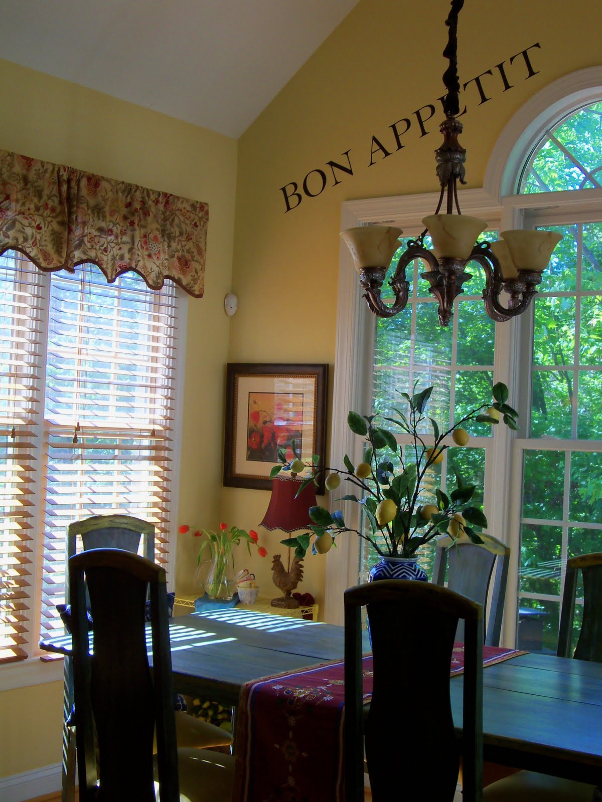 OK first off so NOT cheesey! Second I want to sleep over and have breakfast in that room! It is so cheerful and I could sit at that table and drink coffee all day, what a pretty view. Oh and I'll take one rooster lamp and a set of those super cute measuring cups…please! Thank you! So happy I stumbled onto your blog, LOVE it!
